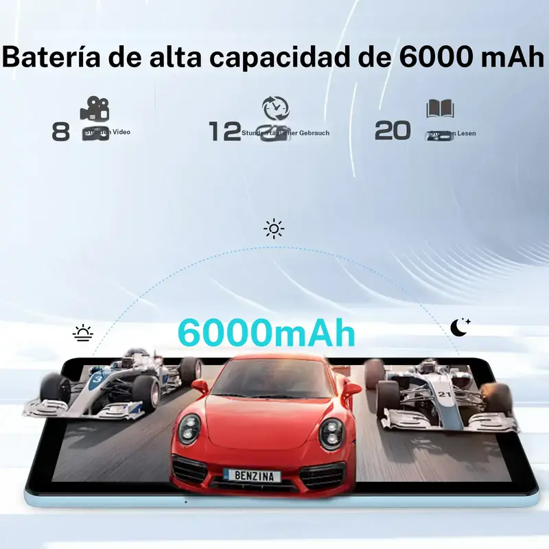 • Modelo de Vida y Camaras:Bateria de 6ooo mAh Para uso durante todo el dia. Dos camaras: una frontal de 2 MP y una trasera de 8 MP para video y fotos. La pantalla HD-IPS (1280 x 800) proporciona imagenes claras. Disfrute de una experiencia de sonido mejorada con Dual-BOx-Lautsprecher y un conector para auriculares de 3,5 mm.